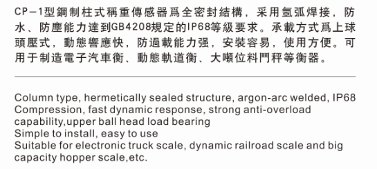 CP-1为全密封结构,可用于制造电子汽车衡、动能轨道衡、大吨位料门秤等衡器