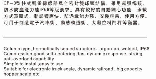 CP-3为全密封双球头结构,可用于制造电子汽车衡、动态轨道衡、大吨位料门秤等衡器